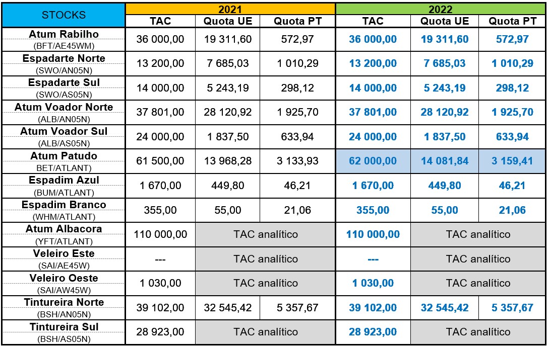 Apresenta-se seguidamente o quadro dos TAC e das quotas portuguesas em 2021 e as aprovadas nesta reunião anual para 2022: