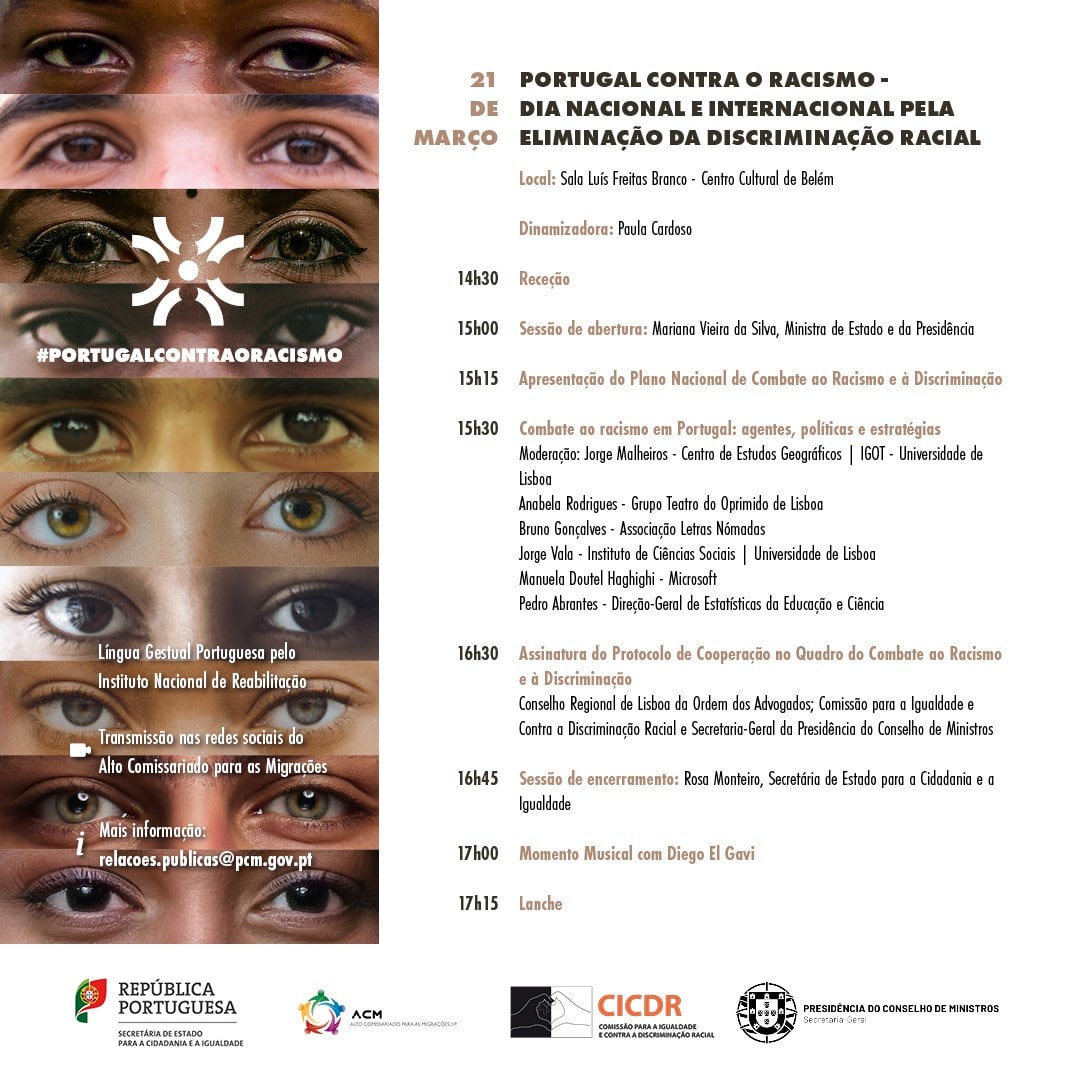 Para assinalar esta data em Portugal, decorrerá hoje, entre as 14h30 e as 17h30, um evento oficial no Centro Cultural de Belém, que terá também transmissão online e em direto nos canais oficiais do Alto Comissariado para as Migrações. Esta cerimónia vai destacar o primeiro Plano Nacional de Combate ao Racismo e à Discriminação e refletir sobre políticas e estratégias de combate ao racismo. Inscrições aqui: https://forms.gle/MKb9ud3fLKxxiiGh9