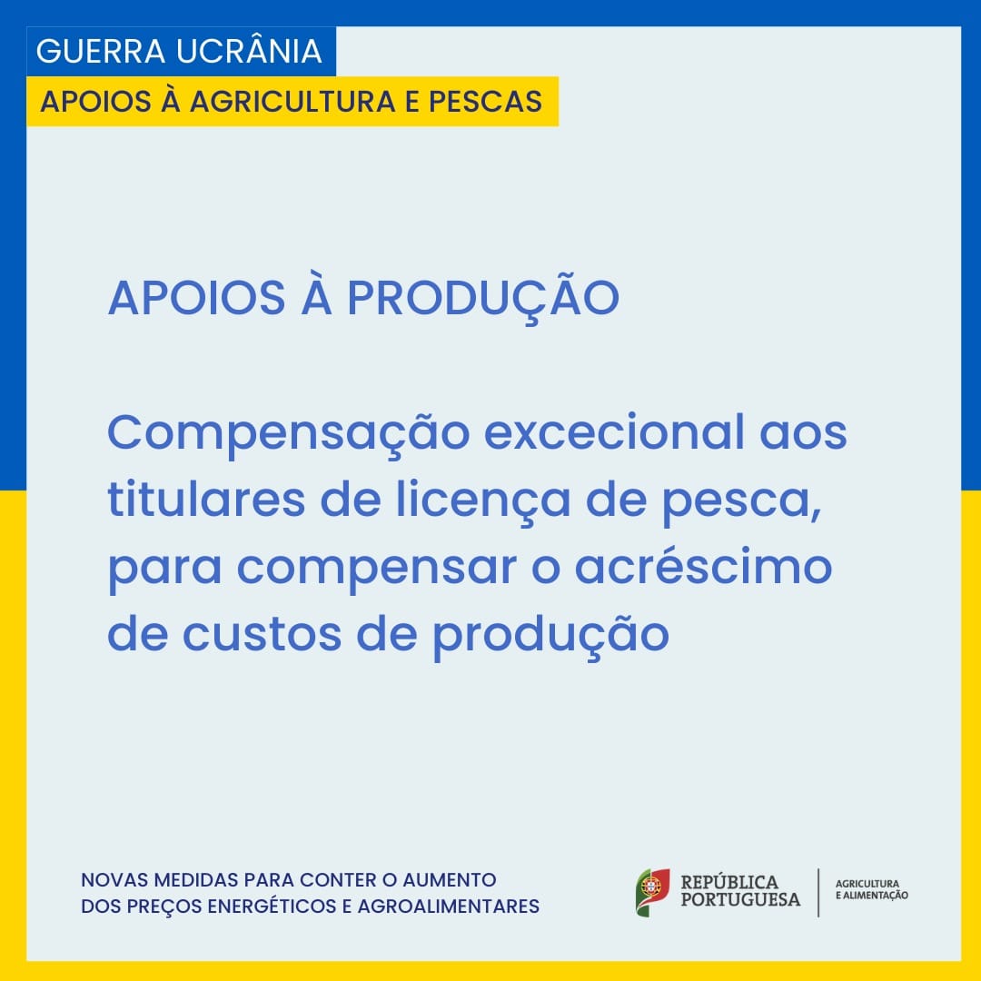 No que se refere à pesca, interessa realçar que foi aprovado um Decreto-Lei que cria um regime excecional e temporário de compensação destinado aos profissionais que exploram as embarcações, pelo acréscimo de custos de produção provocada pelo conflito armado na Ucrânia.